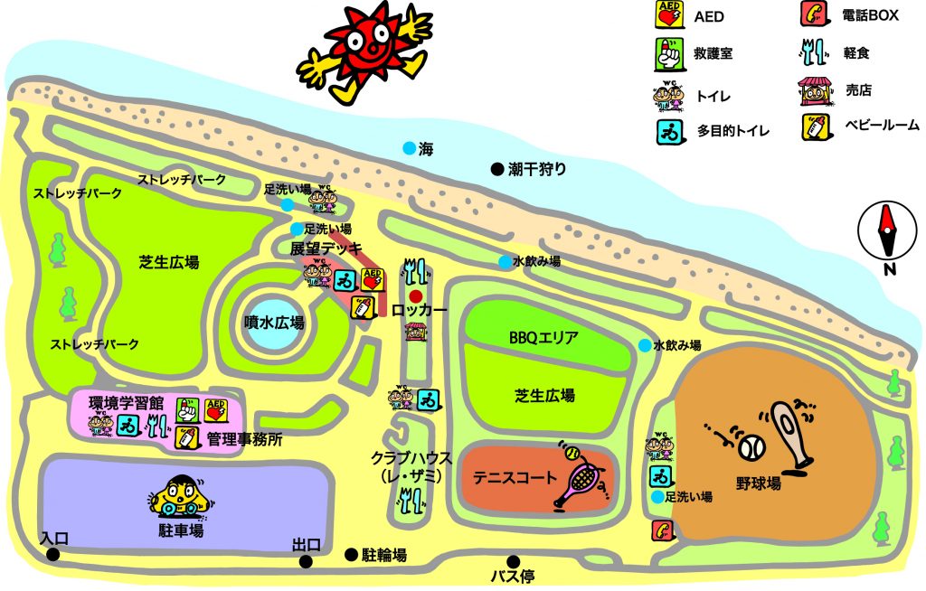 ・噴水広場、芝生広場、展望デッキ、潮干狩り場が楽しめる